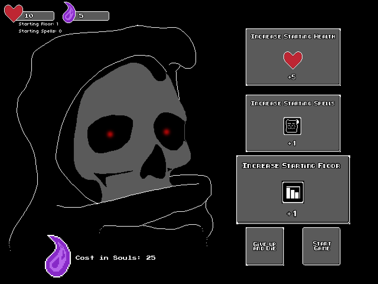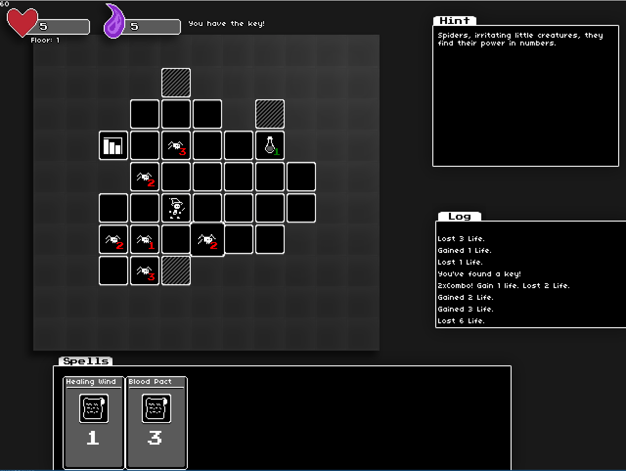 In Consume, you move around the board by clicking on adjacent tiles with your mouse. If you enter a tile occupied by an enemy, you will need to trade your own life force to absorb their blood soul. Souls are used as currency to be exchanged for permanent upgrades from the shopkeeper, he is found when you meet your inevitable demise. Spell scrolls can also be found scattered throughout the dungeon floors (spells do not consume life force to cast). Other items that can be found inside the dungeon are health potions and multiplier wands (this item multiplies number values of both health potions and enemies in adjacent tiles, so use wisely). Consume also uses a combo system, absorb multiple enemies in a row to reduce the amount of life force used and recieve additional blood souls to exchange for permanent upgrades.